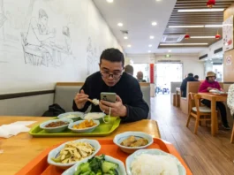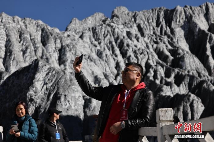 图为一位海外华媒代表在墨石公园观景台自拍。王磊 摄