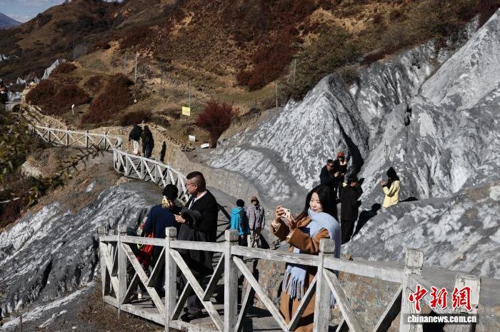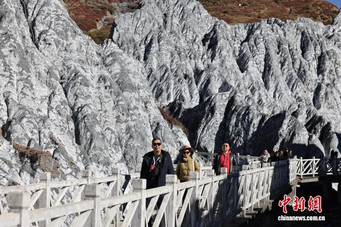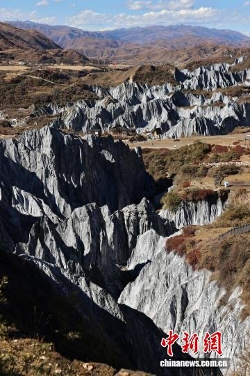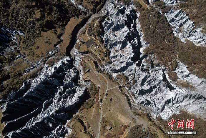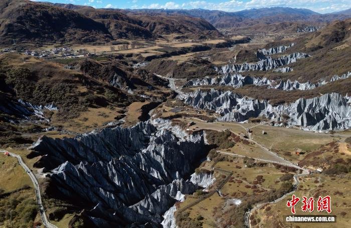 11月10日,来自世界各地的20余位海外华文媒体代表前往四川省甘孜藏族自治州道孚县,探秘有着“异域星球”之称的墨石公园。这里拥有独具特色的糜棱岩石林景观,石柱、石笋、石槽千姿百态,大自然的鬼斧神工吸引着八方游客。图为航拍墨石公园景色。(无人机照片)中新社记者 王磊 摄