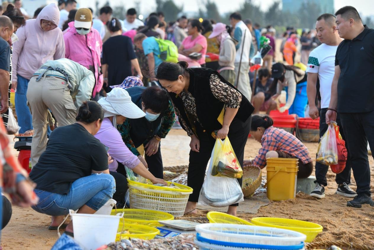 巴中通讯社11月12日综合讯——傍晚时分,海口西海岸的百年小渔村荣山寮迎来最热闹的时刻。渔民们满载而归,刚打捞上岸的鱼、虾、蟹被倒在沙滩上,供人现场挑选。游客与村民交织其间,吆喝声与海浪声相互交融,构成一幅生动的海边“渔歌图”。