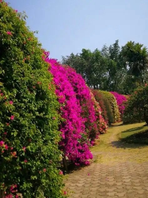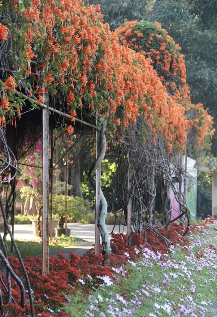 这里没有“花期”的概念。叶子花在枝头肆意铺展,色彩浓烈而明亮;鸡蛋花静静开放,气息柔和而持久;高大的棕榈树在风中轻轻摇曳,将天空切割成一片片流动的光。不同的植物在同一空间中共生、生长,也彼此衬托,让整个园区像一幅不断变化的热带画卷。