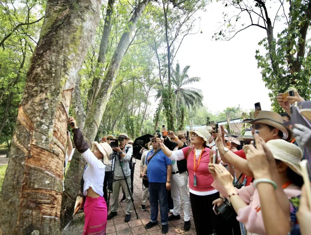 园区以一种温和而有序的方式呈现热带世界。叶子花园、五树六花园、棕榈区、滨水花卉区,各自拥有不同的节奏与层次。西双版纳的热带,不只是“被观看”。果实成熟时,可以亲手采摘;在橡胶林中,可以看到树皮被轻轻划开,乳白色的汁液缓缓流下,花卉植物因此有了生活的质感。